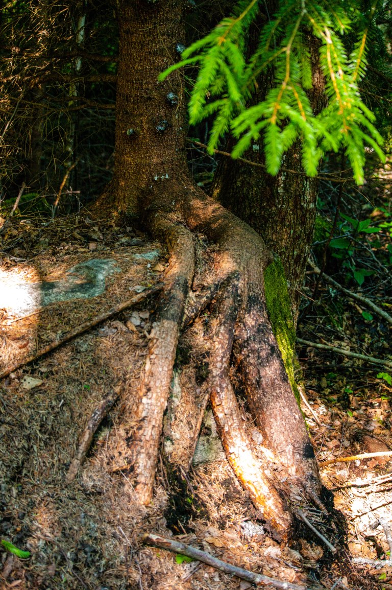 Bävern skulpterar i skogen där granen står på styltor i gammelskogen.