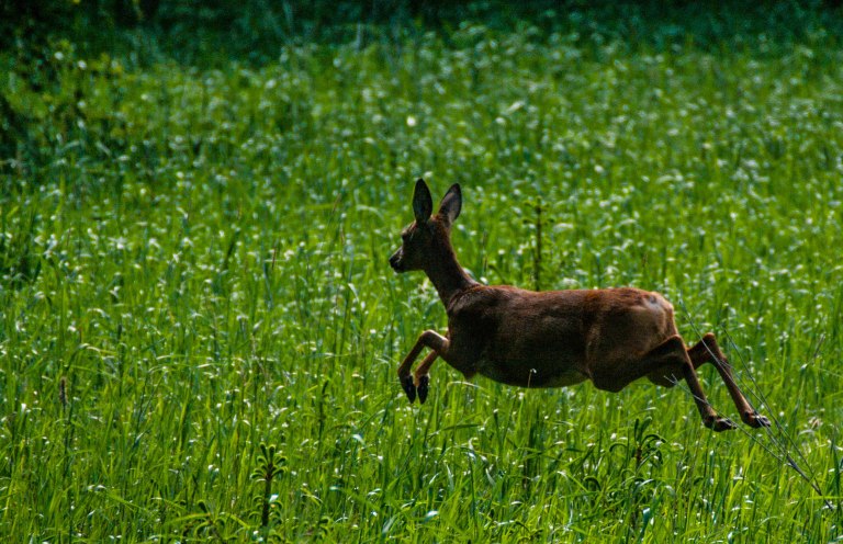 Den gröna sköna skogen har många nyanser. Bland trädtopparna hörs sång. Storöra tittar vaksamt fram och flyger iväg med stora skutt.