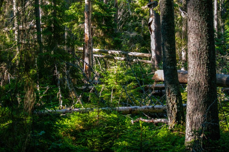 The beaver makes sculptures in the old forest, where the fir trees seem to be standing on stilts.