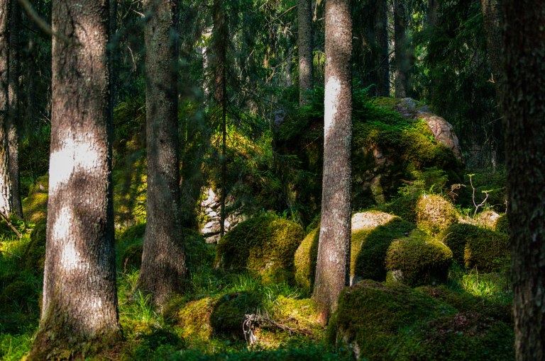 Den gröna sköna skogen har många nyanser. Bland trädtopparna hörs sång. Storöra tittar vaksamt fram och flyger iväg med stora skutt.