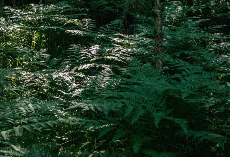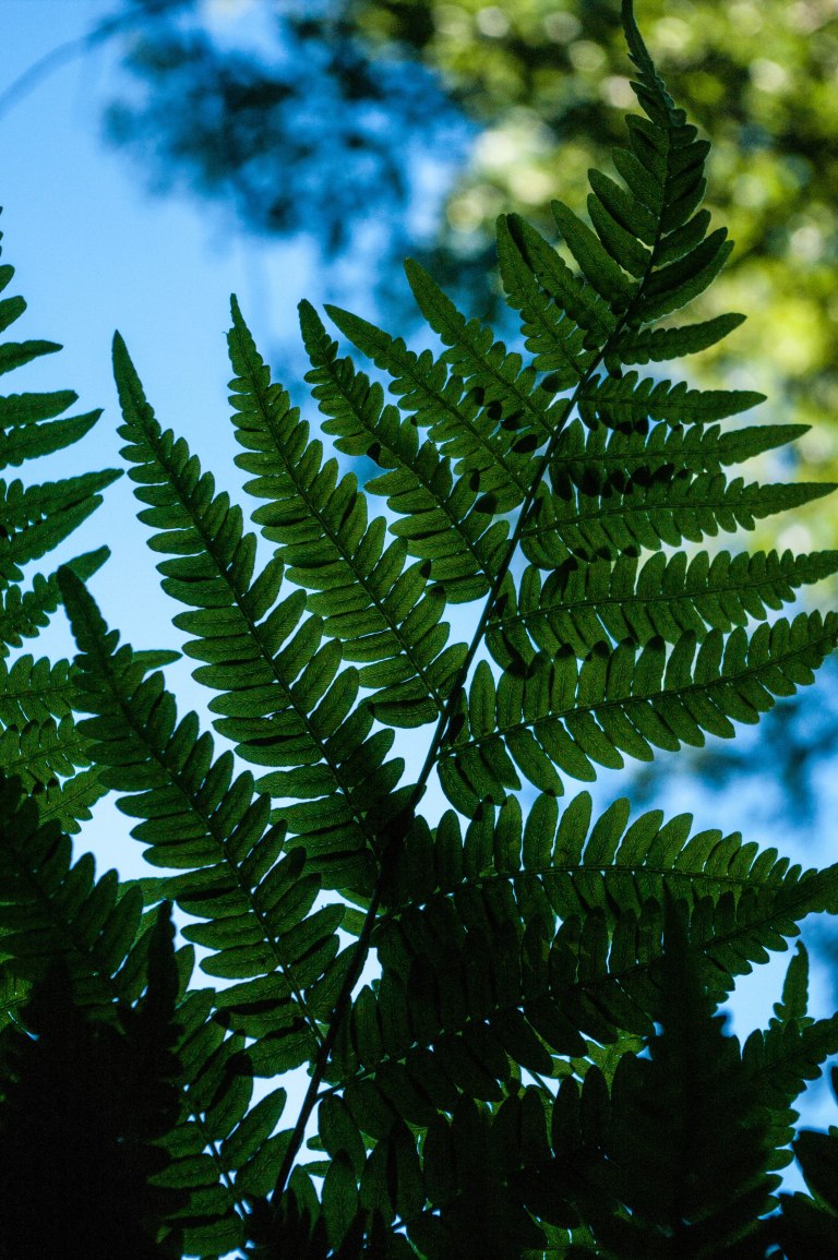 In the world of brackens, the light is filtered through the big leaves. On the other side one can see the blue sky.