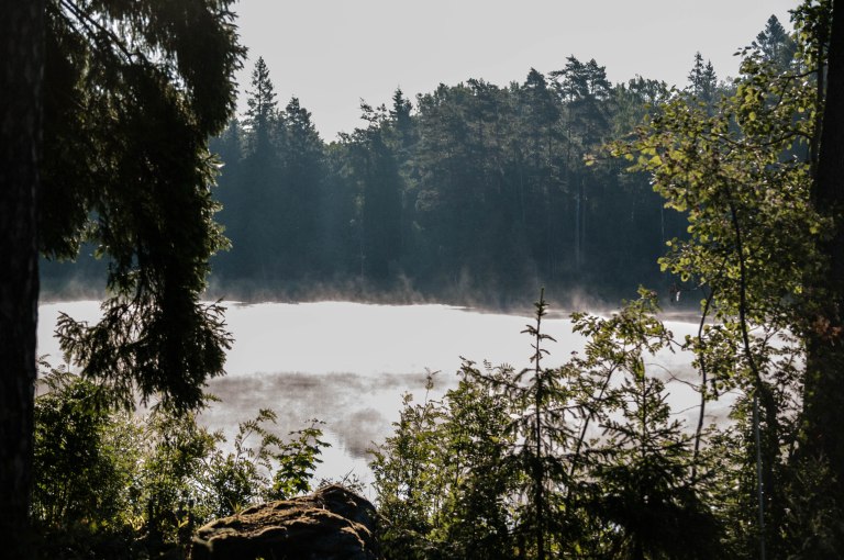 Morgonkylan bär med sej sjörök men snart verkar solens strålar, når ner till bäckbotten och färgar gräset vid vägkanten.