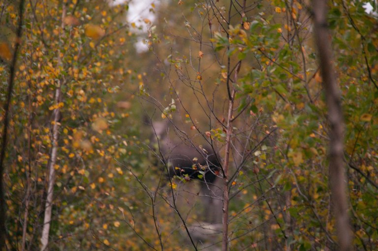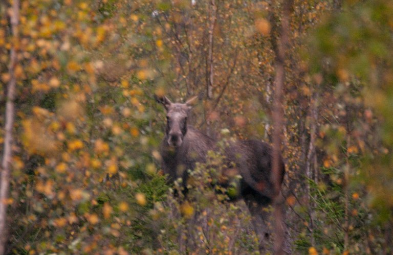 Genom det glesnande lövverket anas en spejande grå skugga -det är en av dom stora som håller koll!