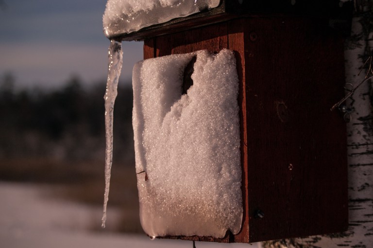 After one of February’s copious snowfalls, the lantern gets a hat and the bulrush gets fur on the fur. Wonder if the birds’ residence is winterized?