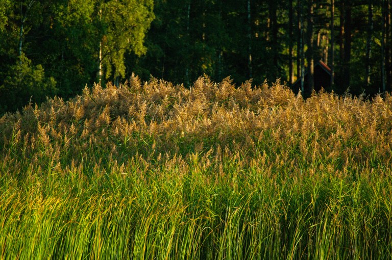 Morgonsolens släpljus är betagande -aldrig glänser vassen som när de första solstrålarna når fram. Urnan liksom buskarna målas i guld. Mamma svan tar fridfullt hand om sin unge utanför eremitens boning så länge ingen rörelse syns.