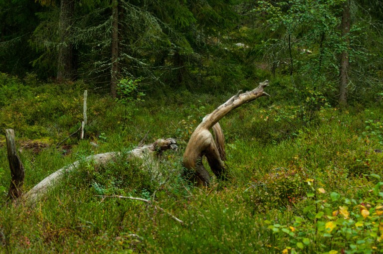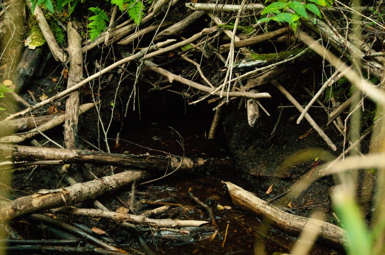 September is still dry, the entrance of the beaver lodge is above the water surface. The prehistoric animals are still standing wondering what is happening in the world; the landscape is an unfamiliar one!