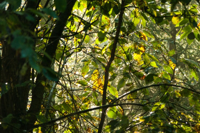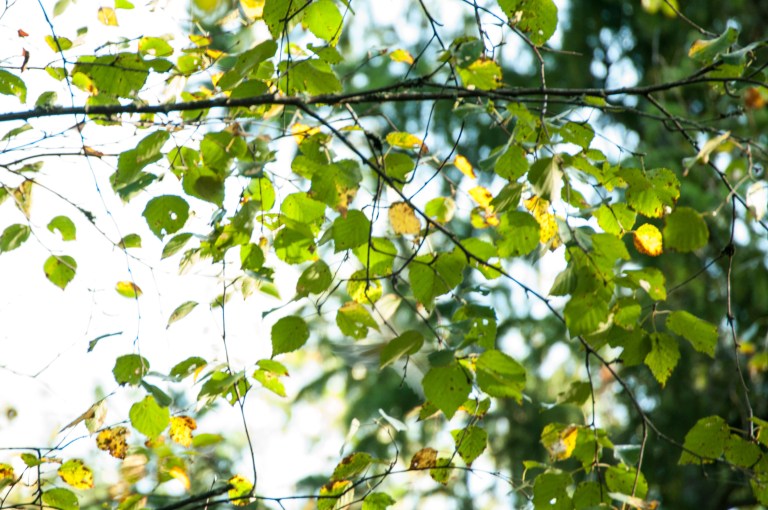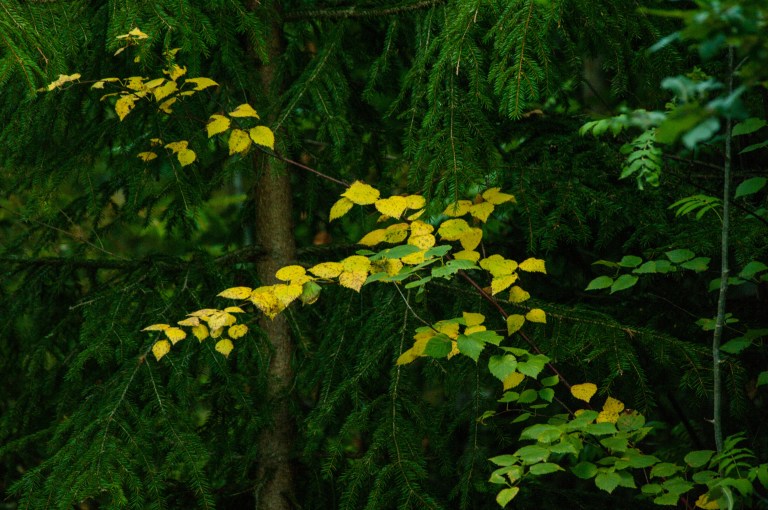 A tour in the woods settles it: Autumn is coming, at first seen only in the shape of one single yellow leaf in the water, but when looking upwards the truth is revealed.