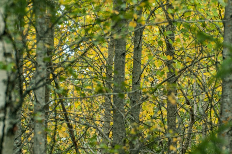 En tur i skogen blir klargörande: Hösten är på väg, först skymtar det som ett enda gult löv i vattnet men när blicken höjs avslöjas sanningen.