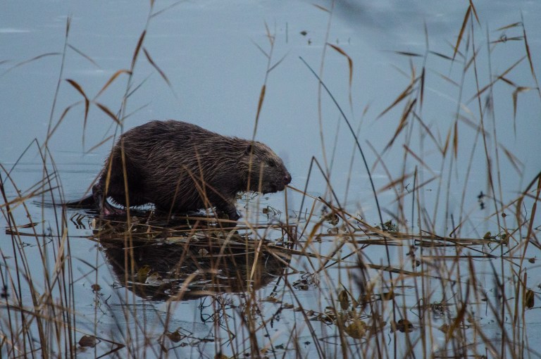 Möjligen har den bruna krabaten bråttom till matstället när morgonljuset bryter igenom gråheten.