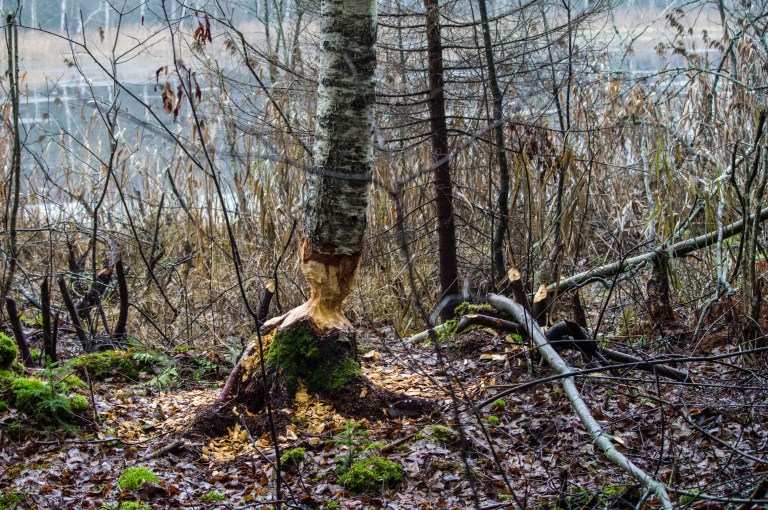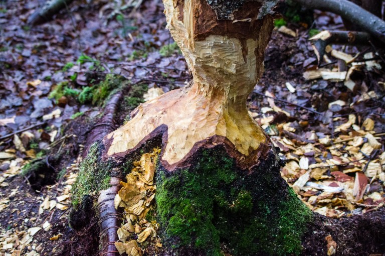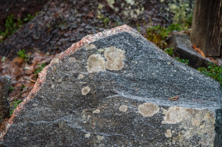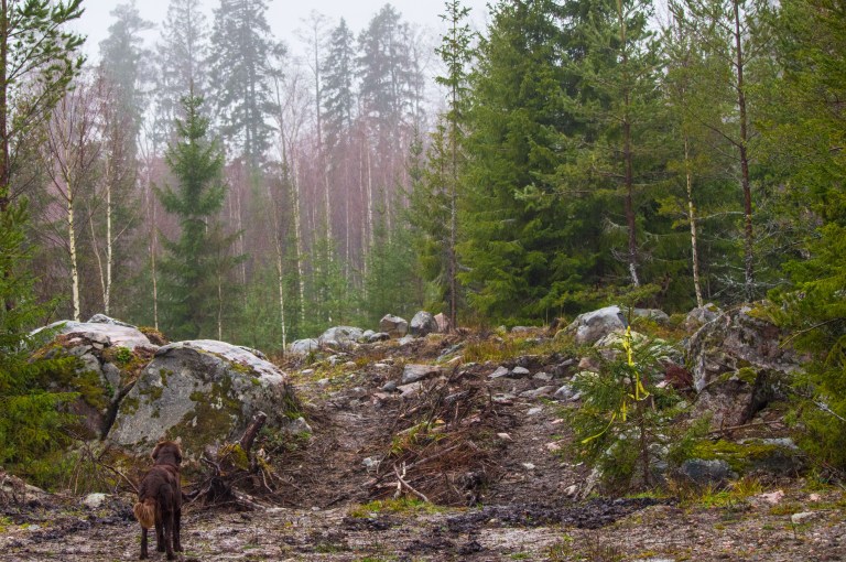 The sun seems to be hanging in the treetops, if showing at all. The brown companion follow the trace of the forest giant and the frost on the stone seems to be coming from its inside.