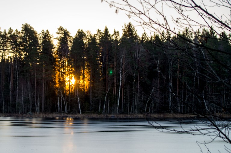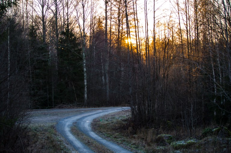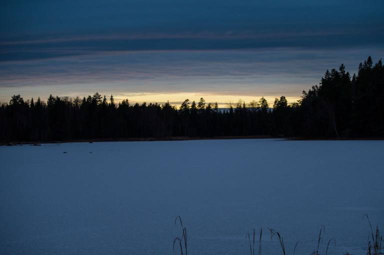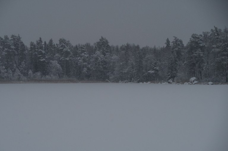 Solen hänger i trädtopparna de få tillfällen den alls visar sej, den brune följeslagaren följer jättens spår i skogen och visst har stenens frost kommit inifrån?