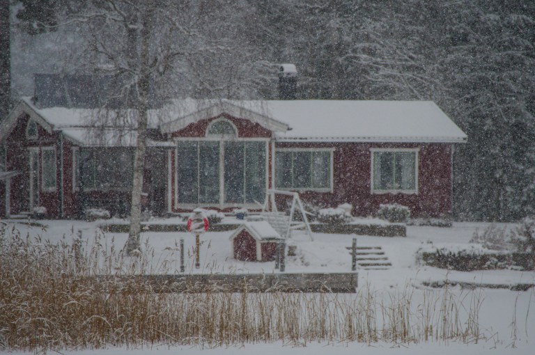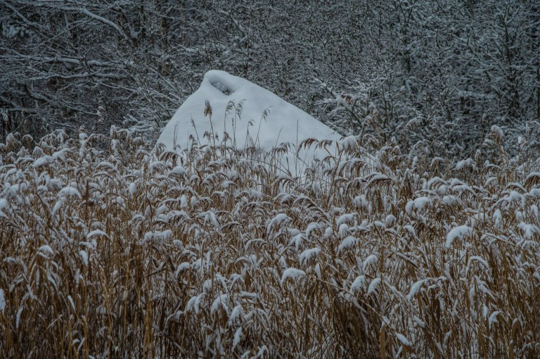 Hur som helst, vassen skaffar sej mössor, snön vräker ner över eremitens boning och visst finns det vita löv? Sikten genom träden minskar.