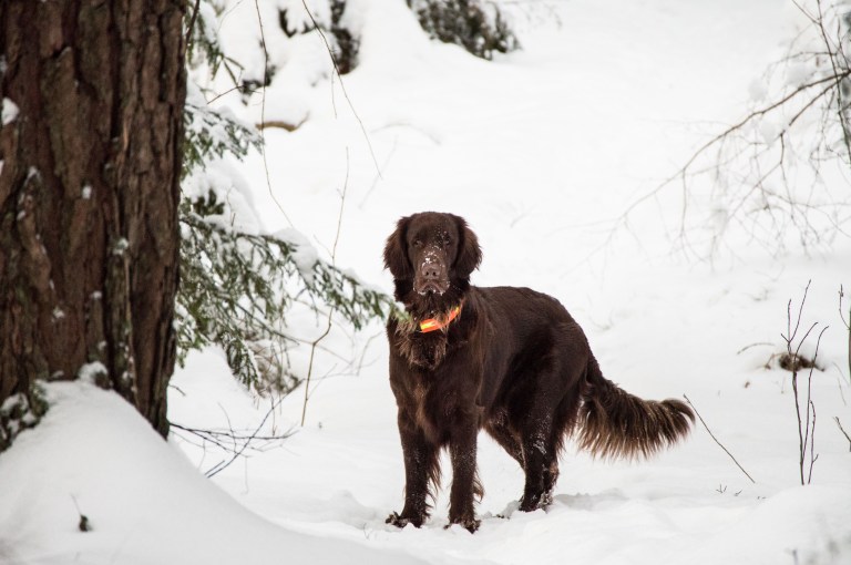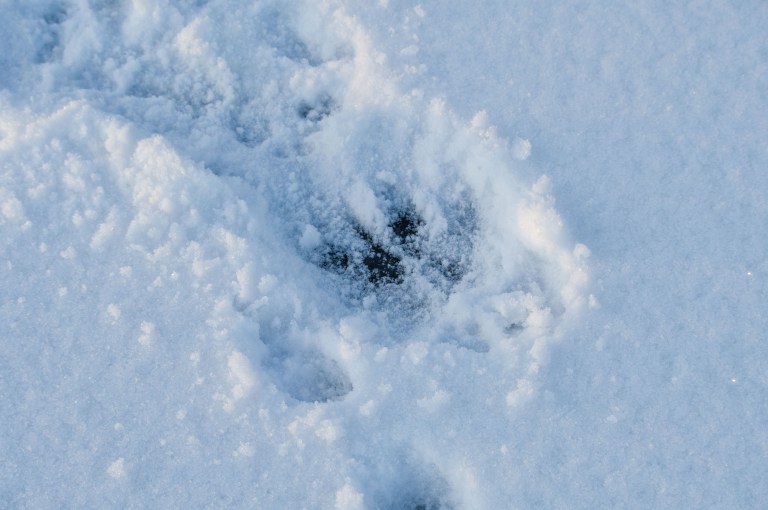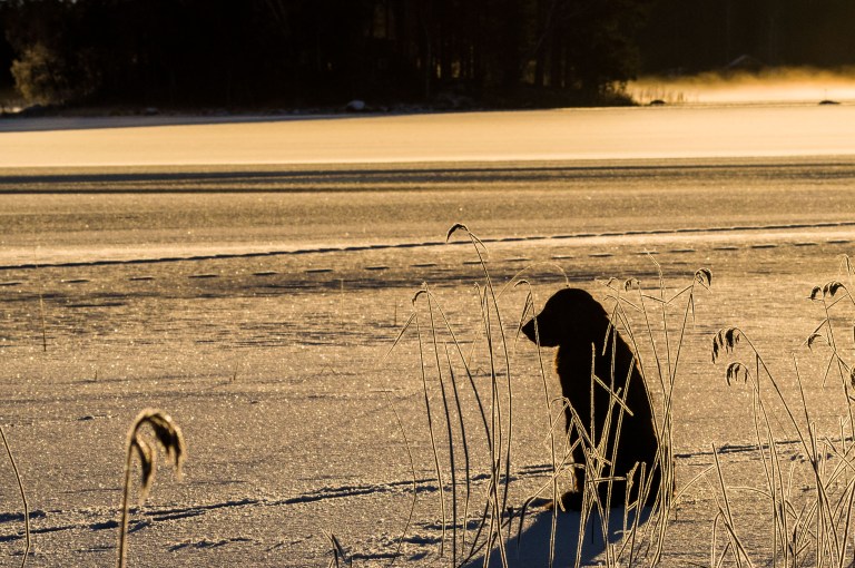 Rimfrost och snöfall skapar januarilandskapet. Det är mycket snö och snart ligger vägen ofarbar. Det hindrar inte den brune följeslagaren som tar en paus efter det mödosamma arbetet att ta sej framåt.
