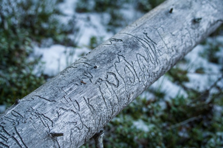En snöstorm drar in med kraft, allt tycks frysa nu. Efteråt skymtar nya aktiviteter och någon har tagit sej tid att rista -kan det vara ett meddelande som går att tyda?