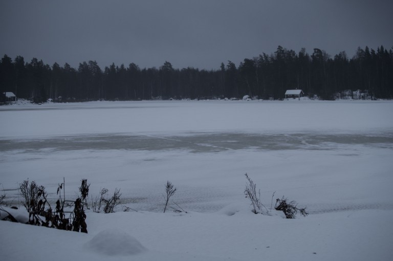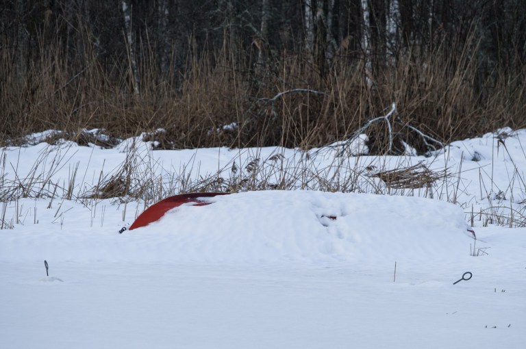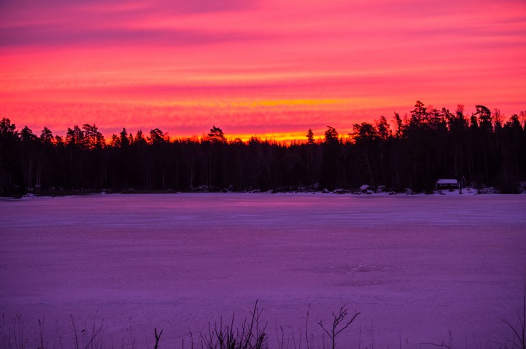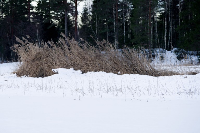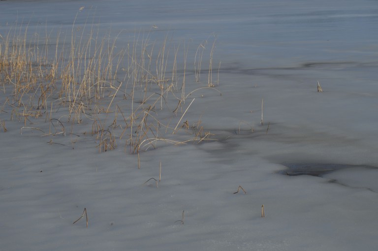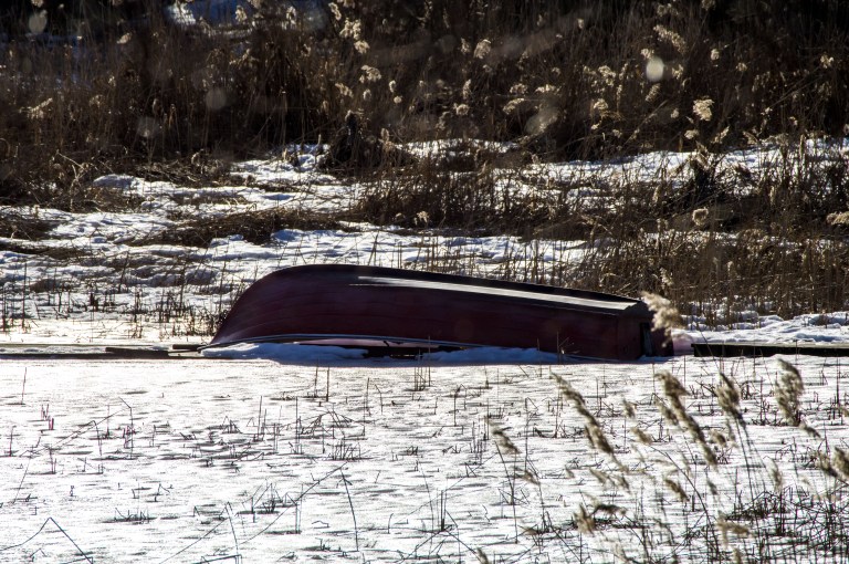 The winter landscape changes, morning starts off colourfully but now things are happening, snow and ice is melting. The red boat and the reed shake the snow off.