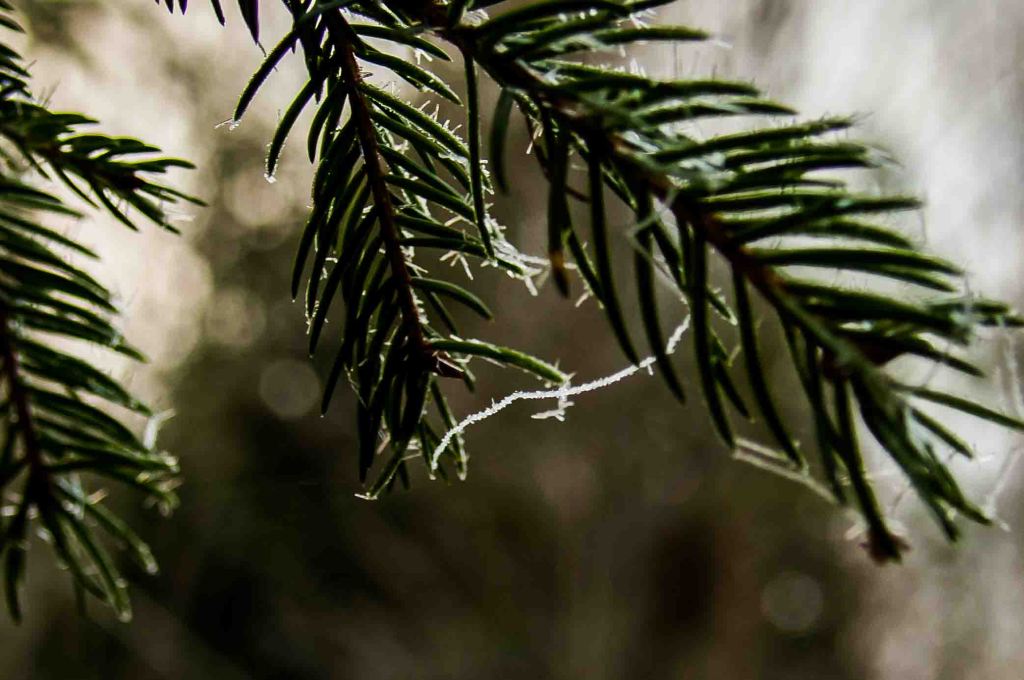 The fir-trees seem to have the power to make snow crystals grow. Despite all the grey, nature carefully uses its pastel paint during days of blue skies. When the sun is out, so are the long shadows and the glitter in the ice.