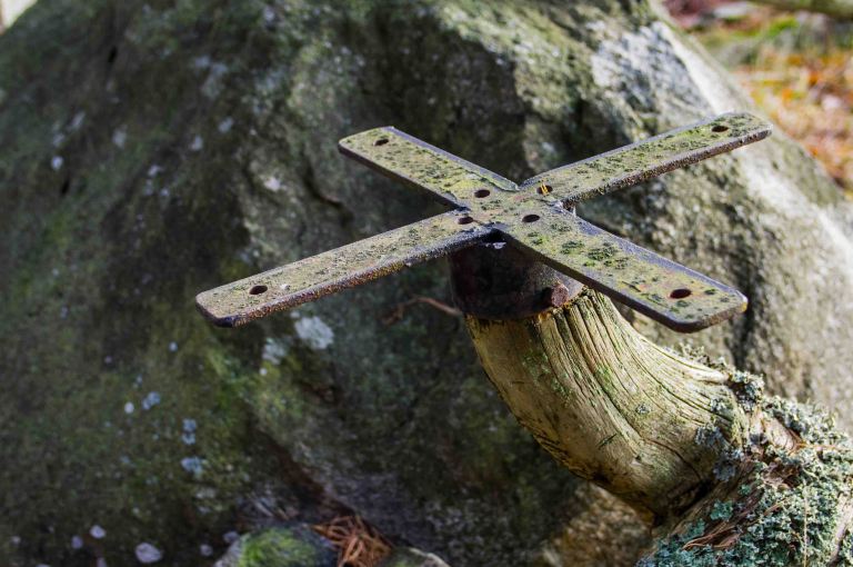 A reminder of the arduous peat industry, an old railroad object now serving as garden decoration.