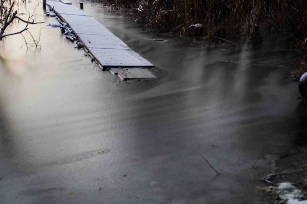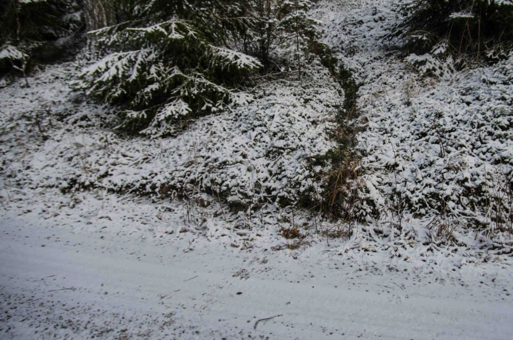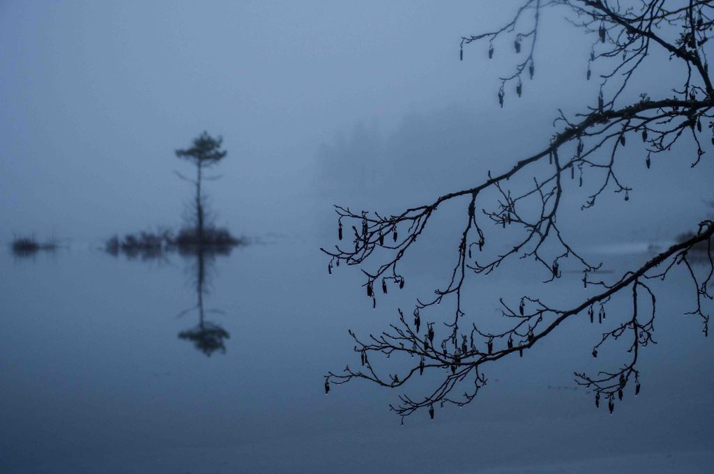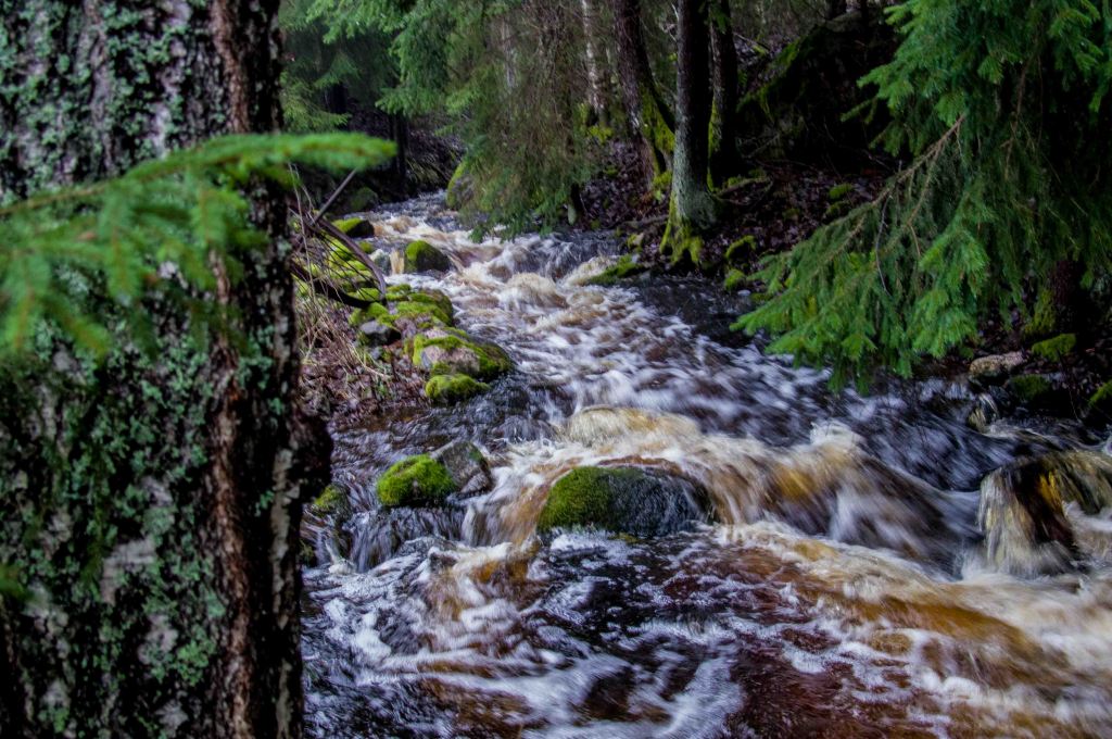Vattenståndet ökade för var dag. Den lilla bäcken blev en mäktig fors, nu är det äntligen brusa som gäller! Utterspår röjer närvaro på natten och natt är det större delen av dygnet. Det grå kommer tillbaka men även i det grå kan man hitta former som fascinerar.