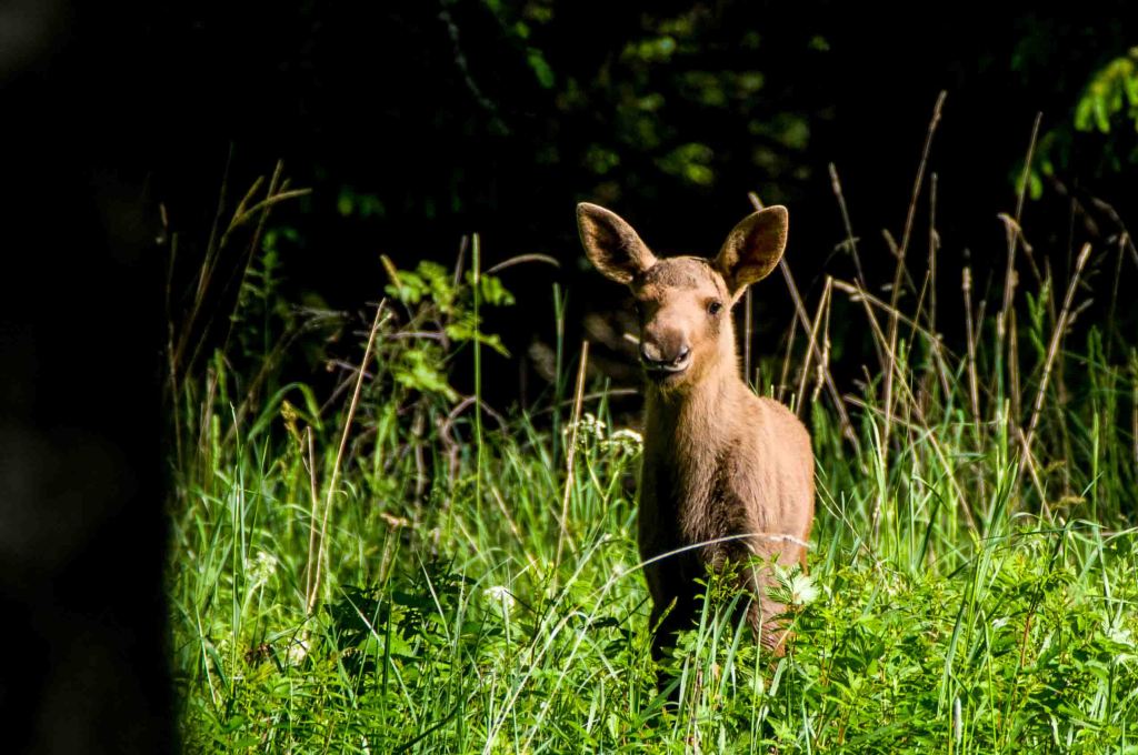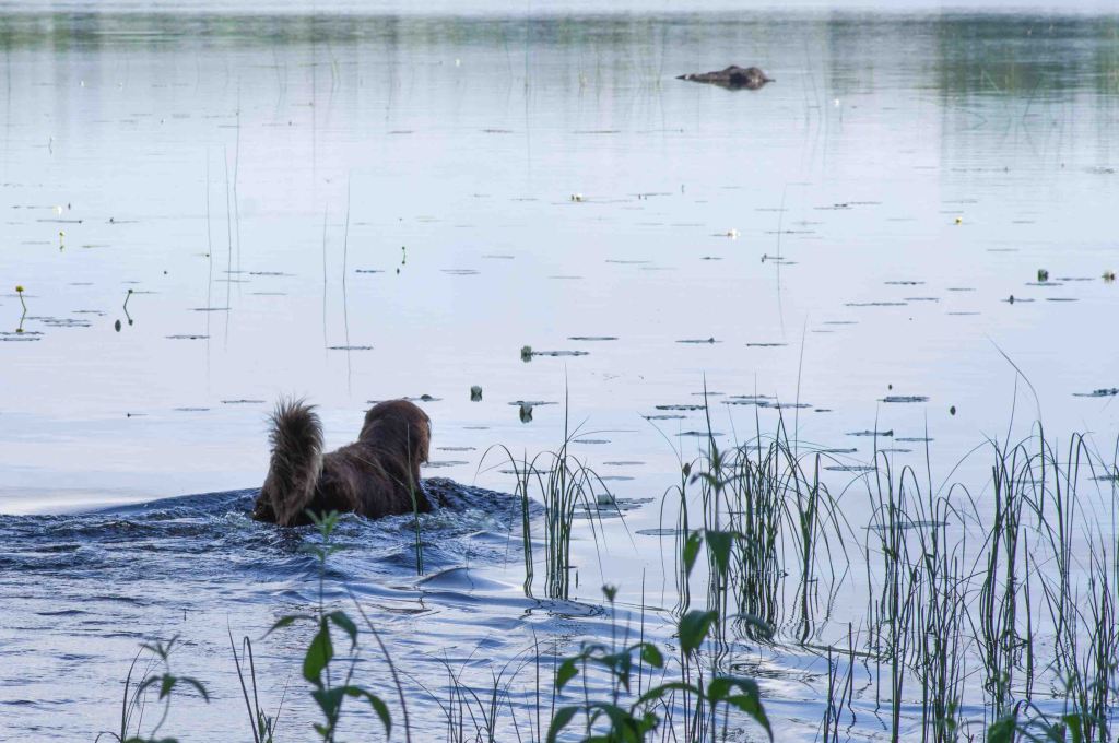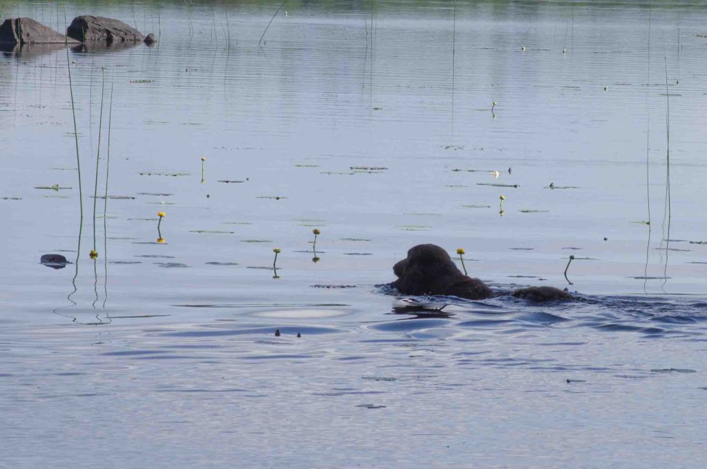 Den brune följeslagaren vistas i vattnet med ett ändamål för ögonen, här är inga nöjesbad. På andra sidan viken syns de ståtliga beta majestätiskt, dom vill vara ifred -kom inte hit, jag har den lille här! Vi förstår och drar oss försiktigt tillbaka.