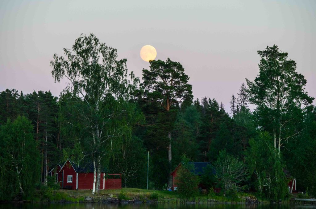 Skogens märkliga varelser är synliga samtidigt som julimånen hänger över udden. Än är det Ruvarn eller mossnabeln. Tur att den brune följeslagaren är reslig som en fura!
