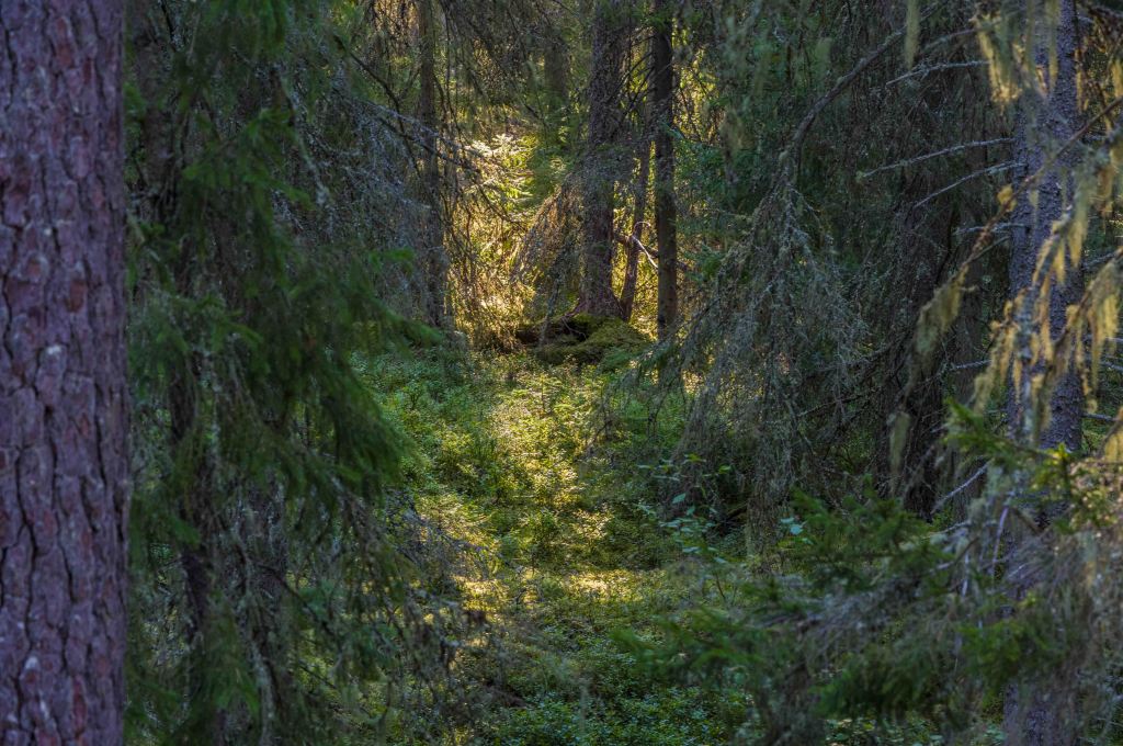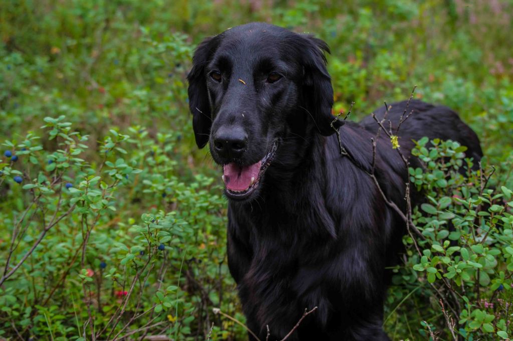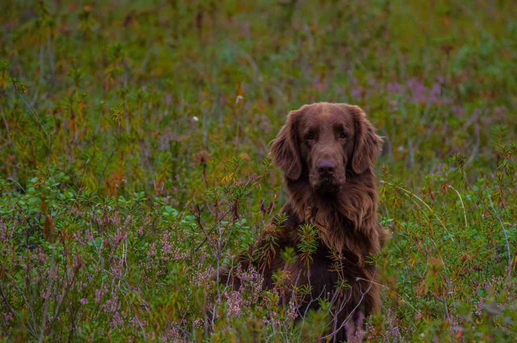 Ute på mossen är det fuktigt i dessa bärtider. Skvattram- och odonbuskarna är jobbiga att forcera för den brune följeslagaren och hans kamrat. Än lyser sommaren mellan träden.