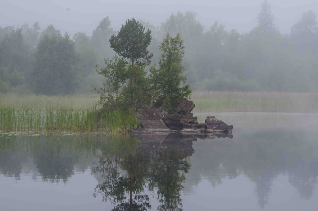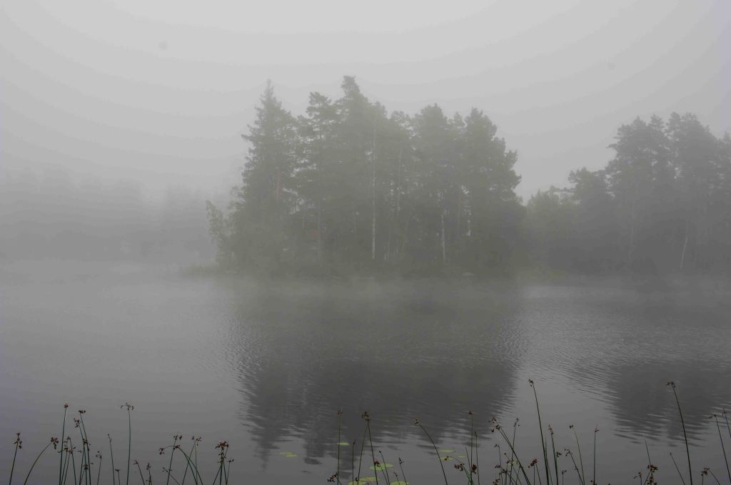 På morgonen efter nattkylan ligger dimma och sjörök. Det är mycket fukt som snart torkar upp.