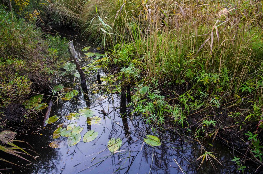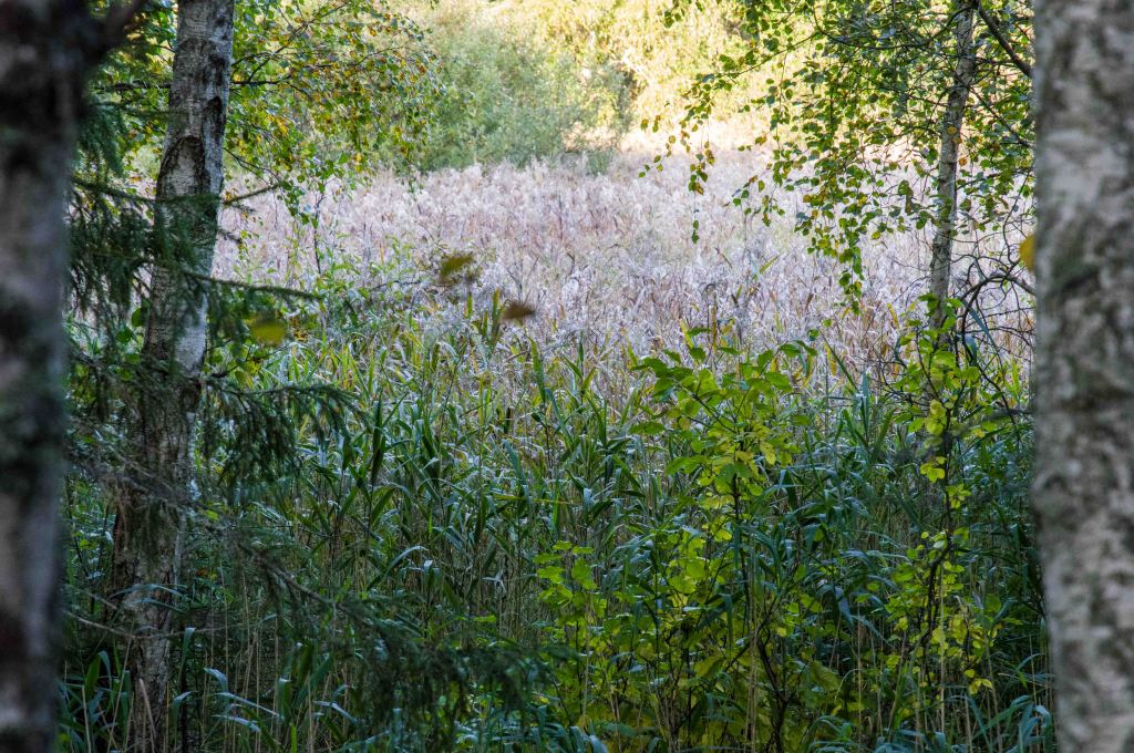 Surely it occasionally rains and the days are getting shorter, but the stream is now completely dry and one can see the remains of the old beaver hut. Further downstreams the old bridge poles stand out more in the colourful reed.