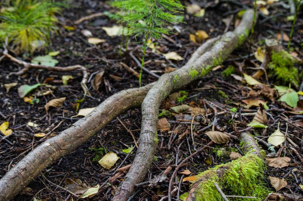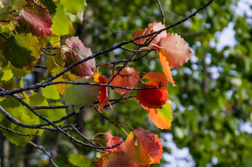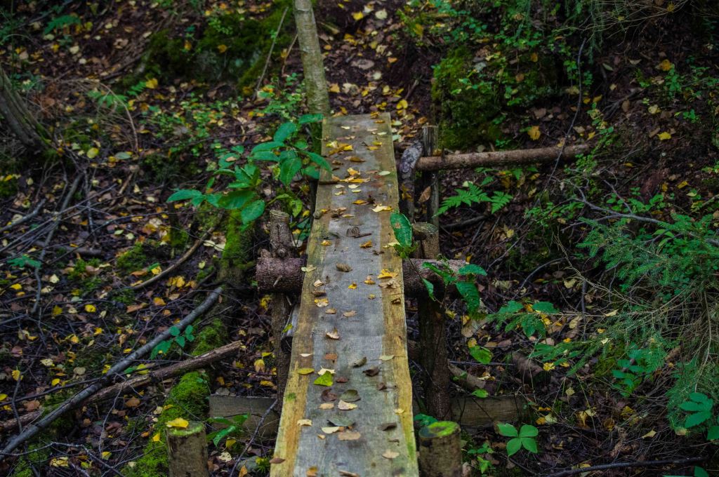 As the mosaic is laid, the footbridge seems to lead to autumn, supervised by the mighty aspen tree. However, all things yellow are not leaves. The fallen tree trunk gradually disappears into decay.
