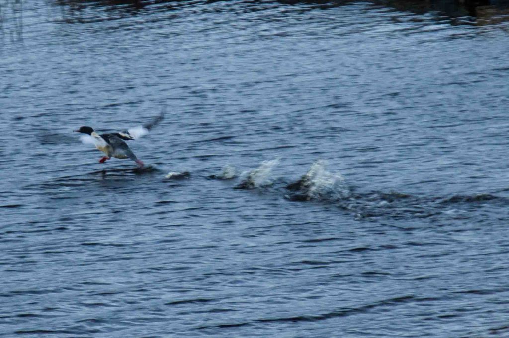 The common merganser escapes as the light reveals other observers, familiar as well as unknown ones.