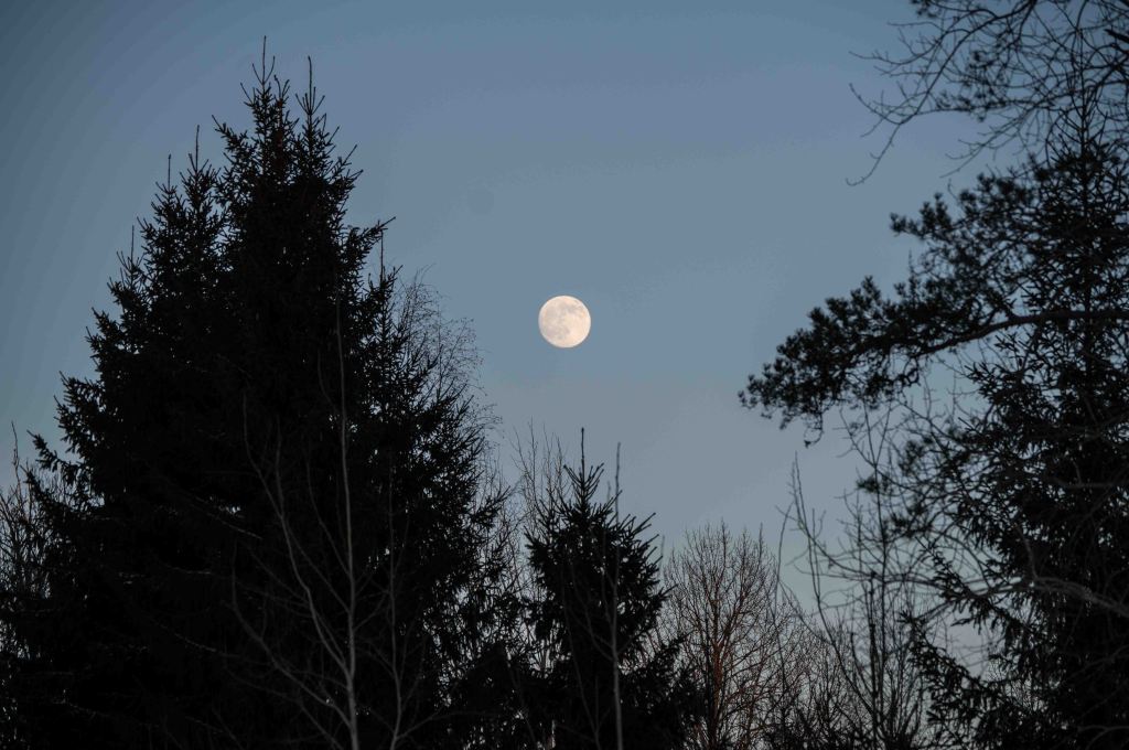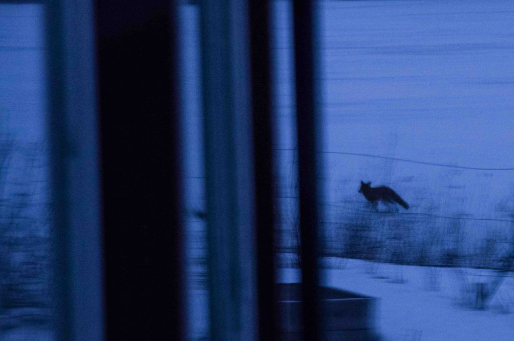 En kväll brinner himlen och räven försvinner runt knuten. Månen tittar fram och avslöjar det vindlande spåret.