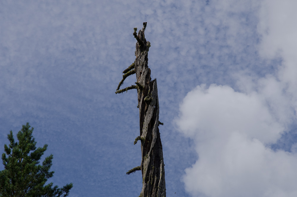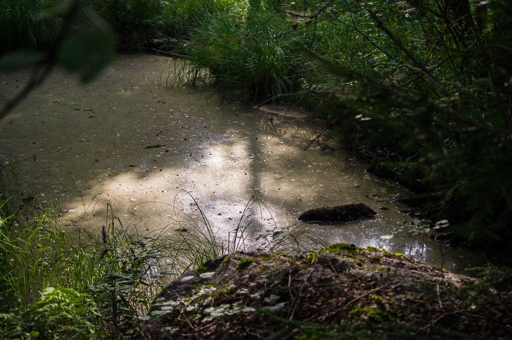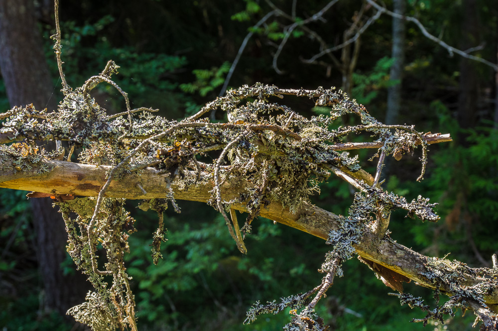 During onw of few hikes in the heat we respectfully knock on the old dead tree – anyone home? Or is there someone to be seen over there, in the woolly sky? And who grows attached to the branch, seemingly feeling at home? The stream has calmed down and collects whatever flies through the air; pollen, insects and dust.