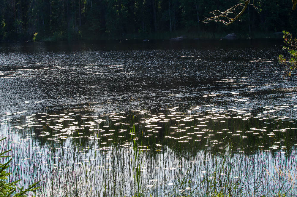 In the morass stands an almost hidden hunting tower. Aspen leaves stand out in the summer sky and the lake is glittering, it sure is enjoyable!