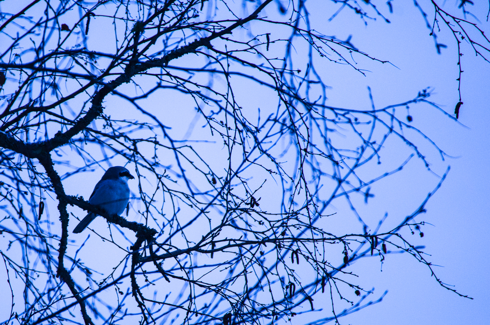 One morning mist brings change. The cold turns aside for some days. With the milder weather a great grey shrike appears, keeping watch before the frost returns.