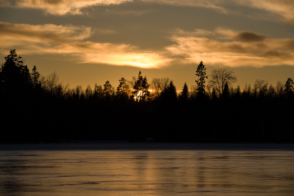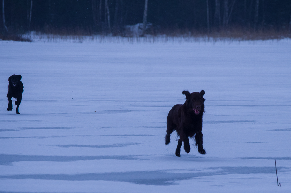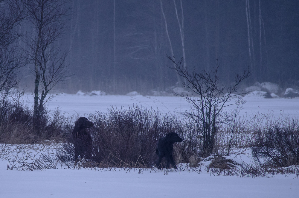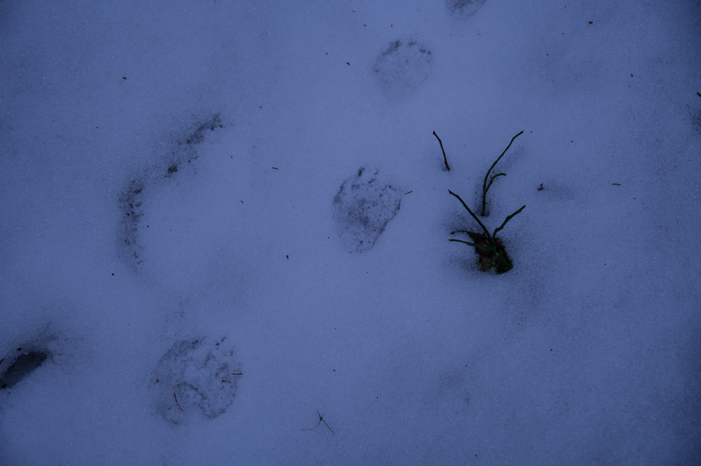 One day as the branches point in the same direction we make another visit to the little winter bather, always on the lookout and ready to dive into the roaring winter water. In the evening the sunset glows. Has the midst of winter passed now? Is that where the paw prints lead – out of winter’s grip?