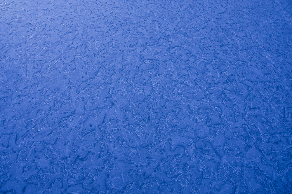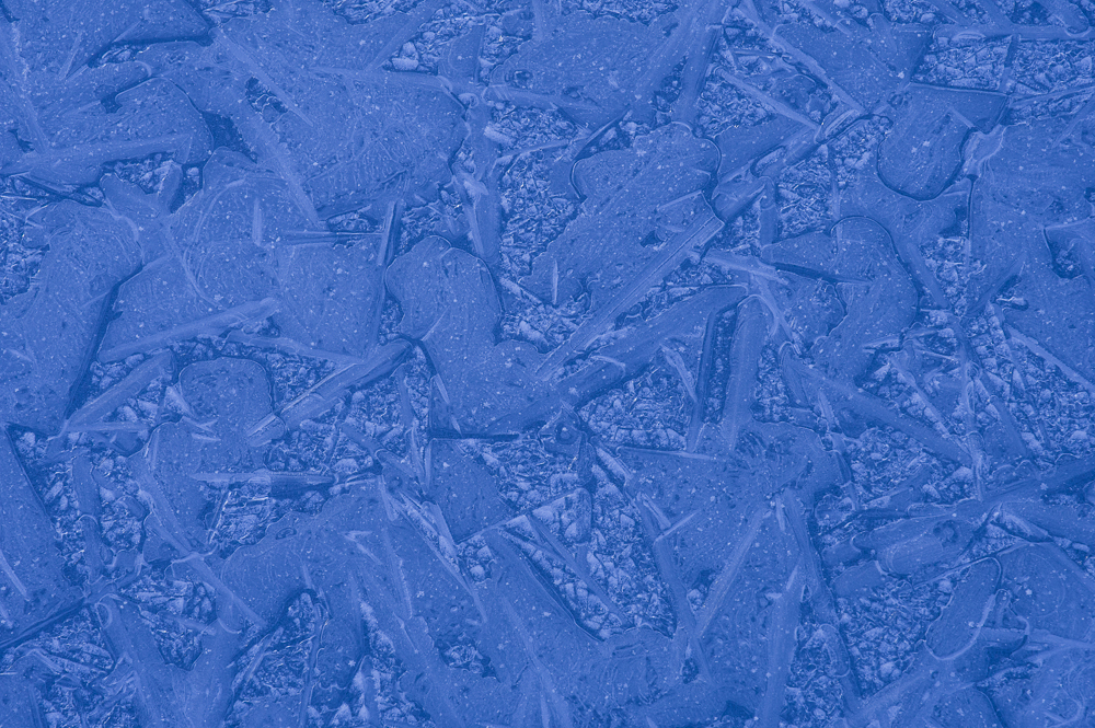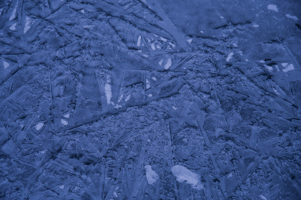 The ice exhibits astonishing patterns and colours in the blue light of dawn. The ice landscape seems to have hardenes with frozen waves.