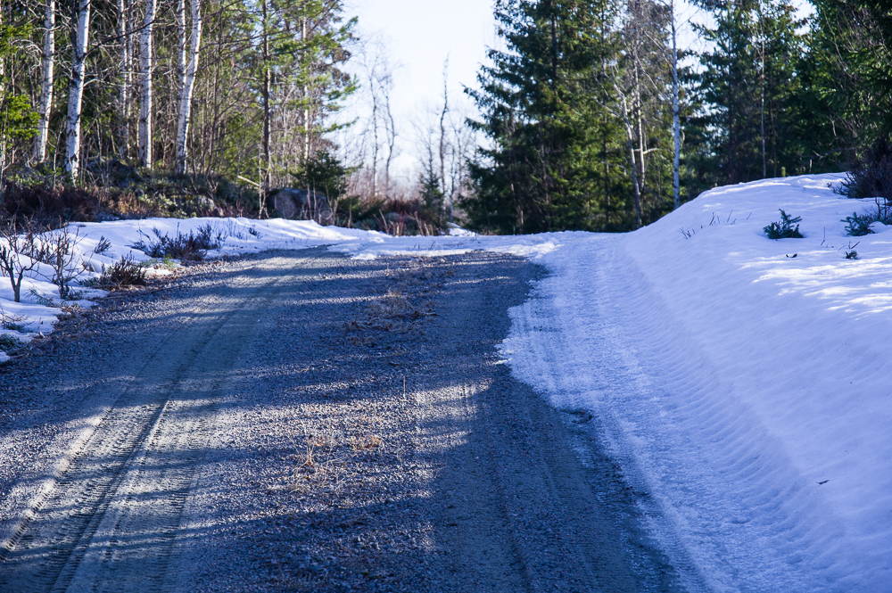 Visst ser det väl ut som isen börjar dra sej tillbaka och stenarna åter tittar fram ur isstrukturen – en del fortfarande vintersömniga och vill inte bli störda. Delar av vägen börjar åter synas. Nåja, visst skymtar även andra? Uttern har också passat på att lämna efter sej!