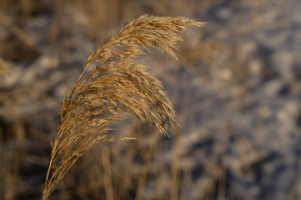 There are brown nuances in the reed, glittering in the sunshine: The companion peeks out!