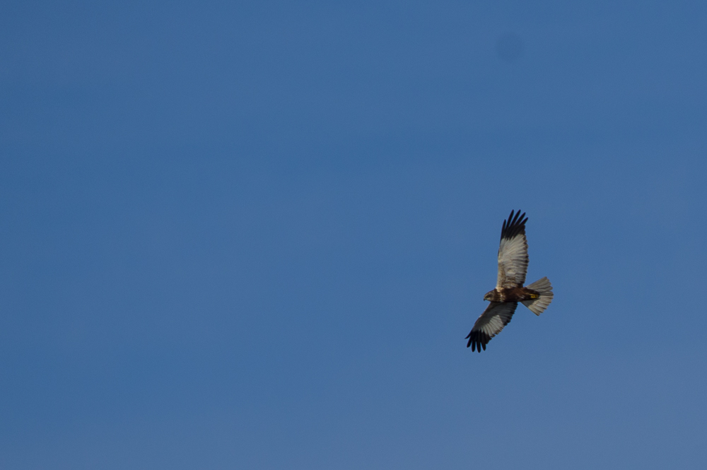 The goosanders are in a hurry and the Marsh Harrier can be seen in the sky.