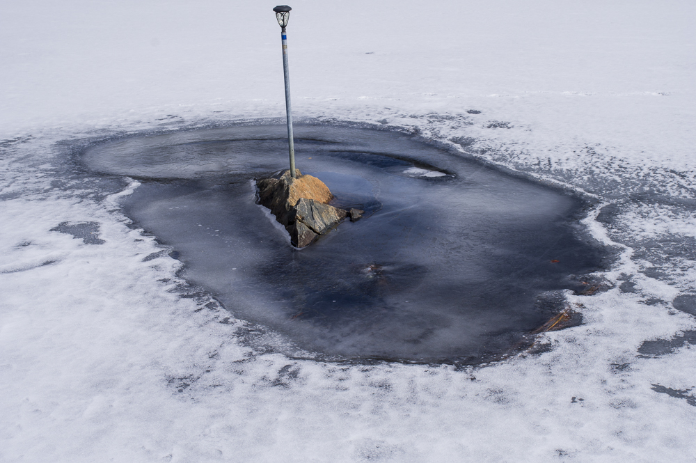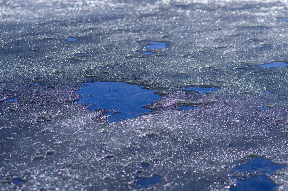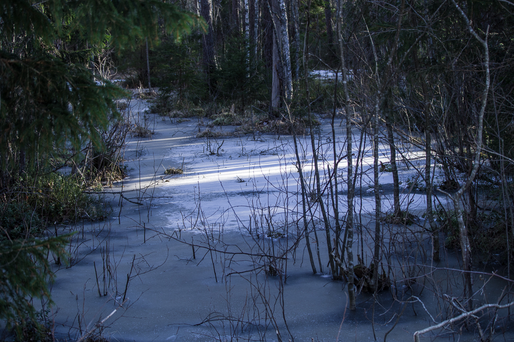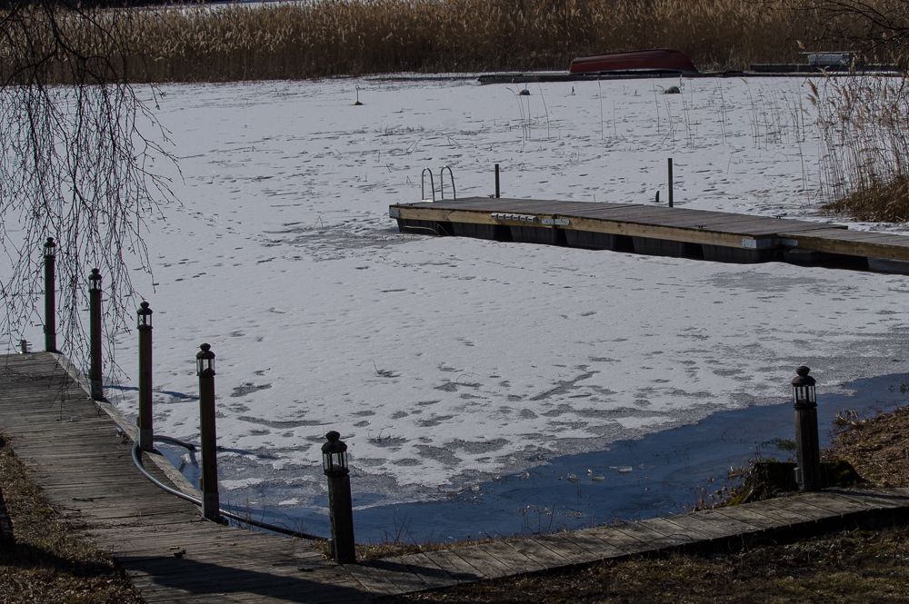 I April kom bakslagen -som alltid väntade. Ändå överraskas man av att tillvaron är tillbaka i vinterskrud när det lovades så mycket vår. Fröken Flinga spejade och spanade och vad fick vi se. Vintern har sitt grepp men det syns en pöl och en spricka på isen. Det utvecklas.