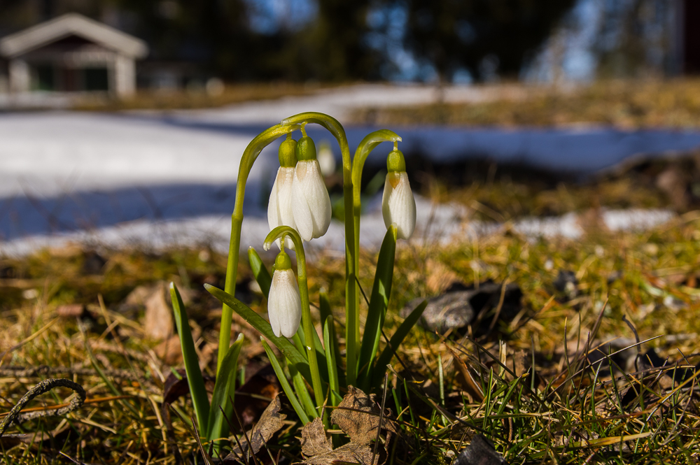 Trots att morgnarna kan vara frostiga så är knipan här och kollar iskanten. Snödropparna tycks inte bry sej och i det blommande videträdet är snart den årliga humlekonferensen igång.
