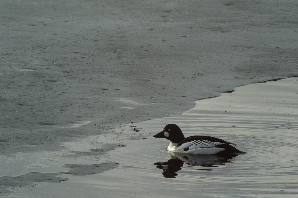 Despite the frosty mornings the golden-eye is here, checking out the edge of the ice. The