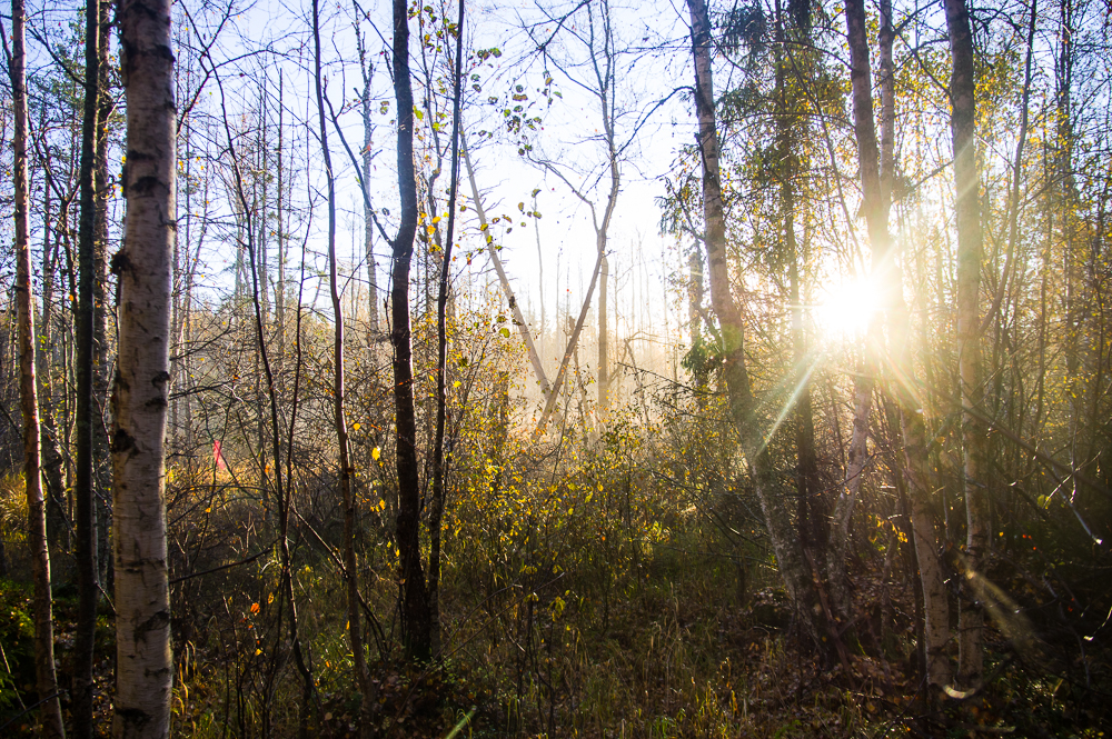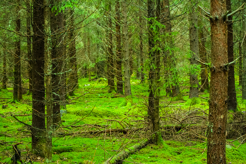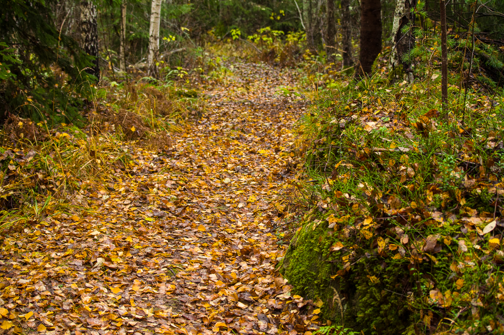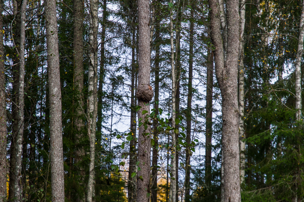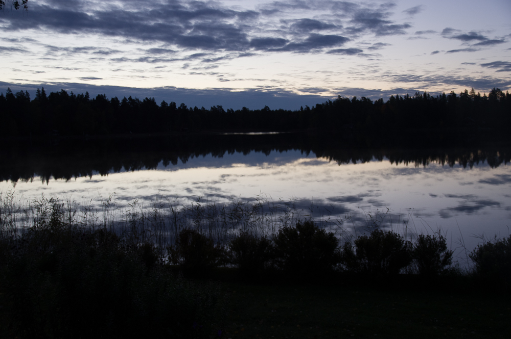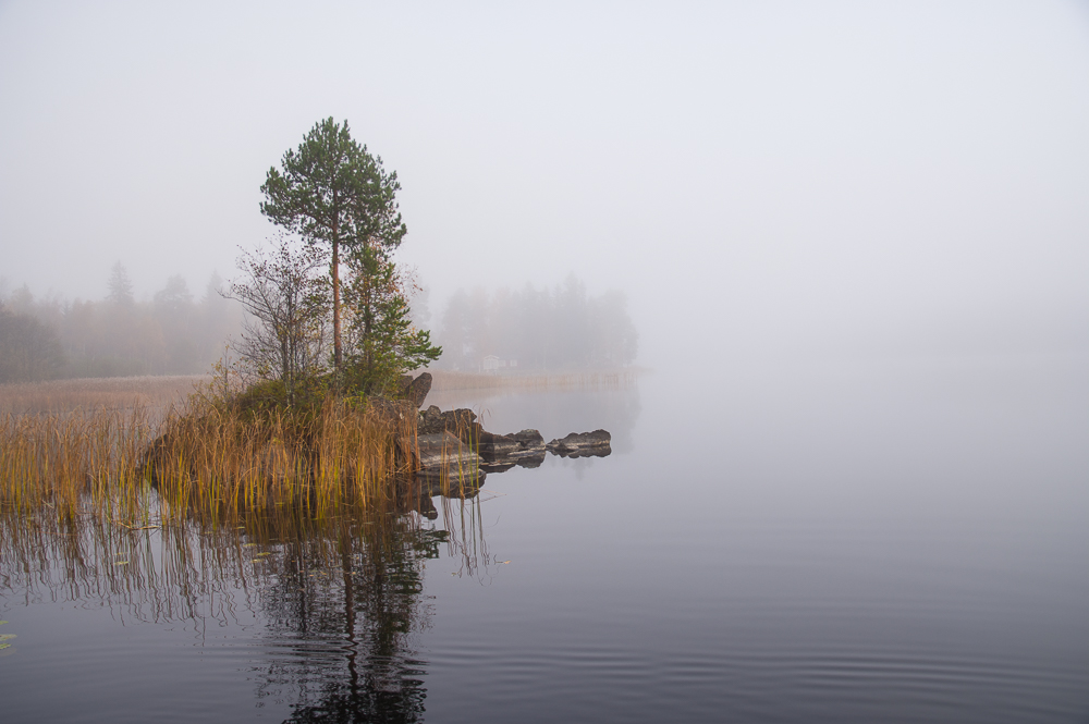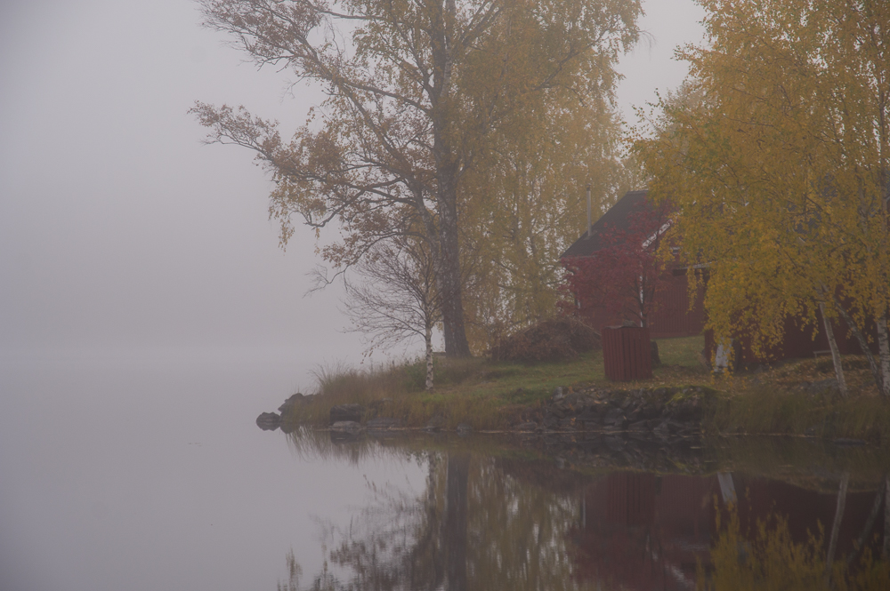 Autumn is ongoing and proceeding, we know the cold will come, but not when. The view changes from glowing colours to misty haze, but in the green moss forest things remain the same, it is as if autumn hasn’t reached down among the straight lines of spruces yet.