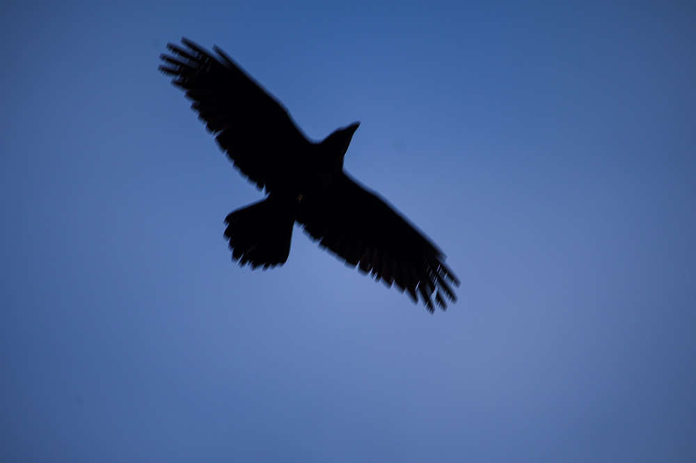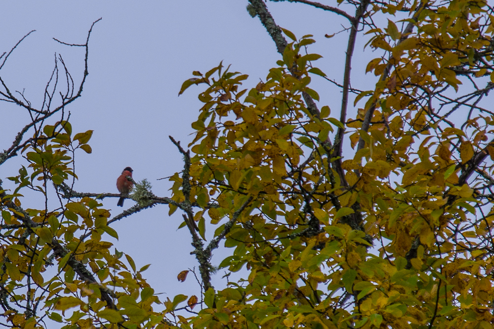 The bullfinch appears, the leaves not able to hide him anymore. The silhouette of the raven is seen in the sky. The view is enjoyable.
