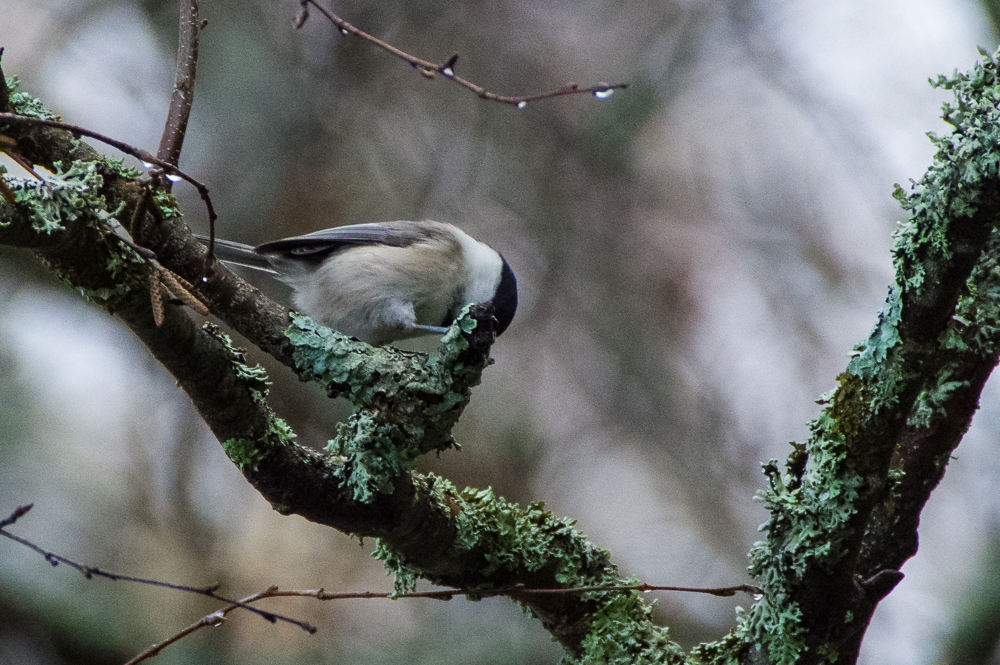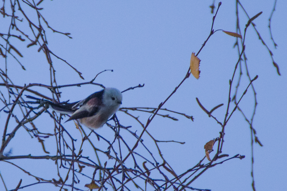 Domherren tittar fram, nu kan löven inte längre dölja honom eller mesarna. Korpens siluett avtecknas i skyn. Man får njuta av utsikten.