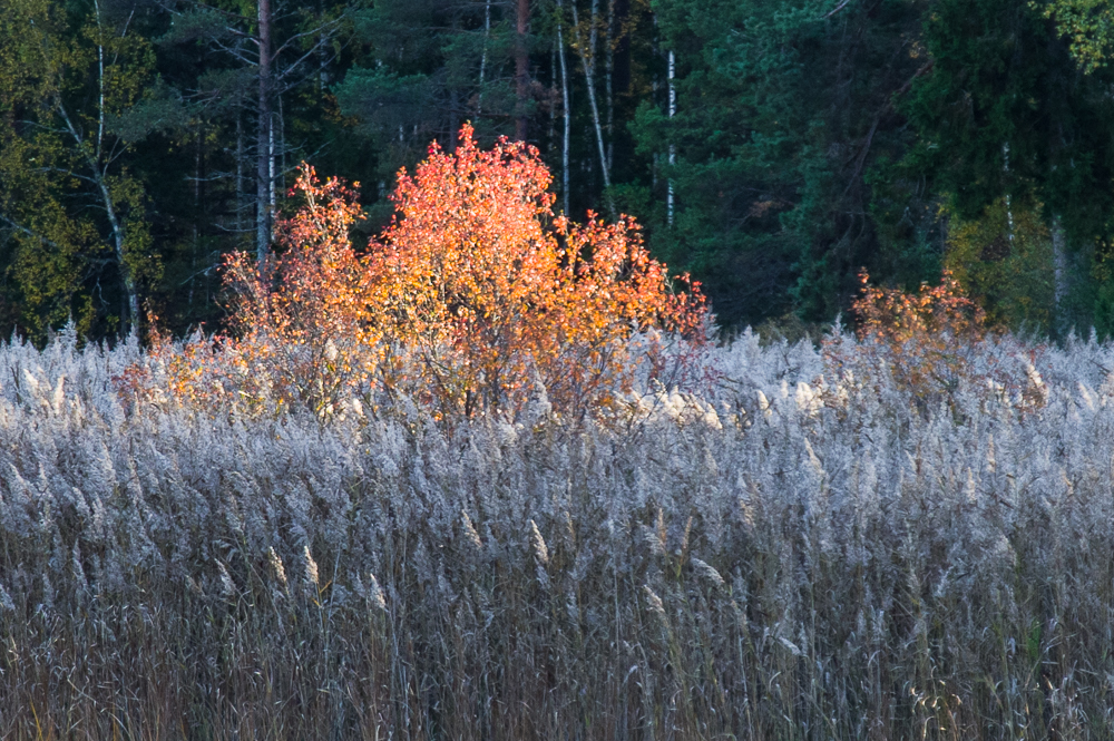 Autumn is ongoing and proceeding, we know the cold will come, but not when. The view changes from glowing colours to misty haze, but in the green moss forest things remain the same, it is as if autumn hasn’t reached down among the straight lines of spruces yet.