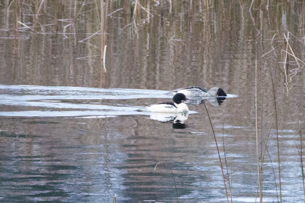 The morning view burns and as the light arrives we find he who should have gone to sleep a long time ago. The mergansers are still fishing.