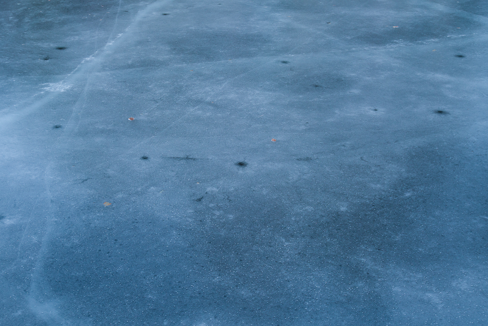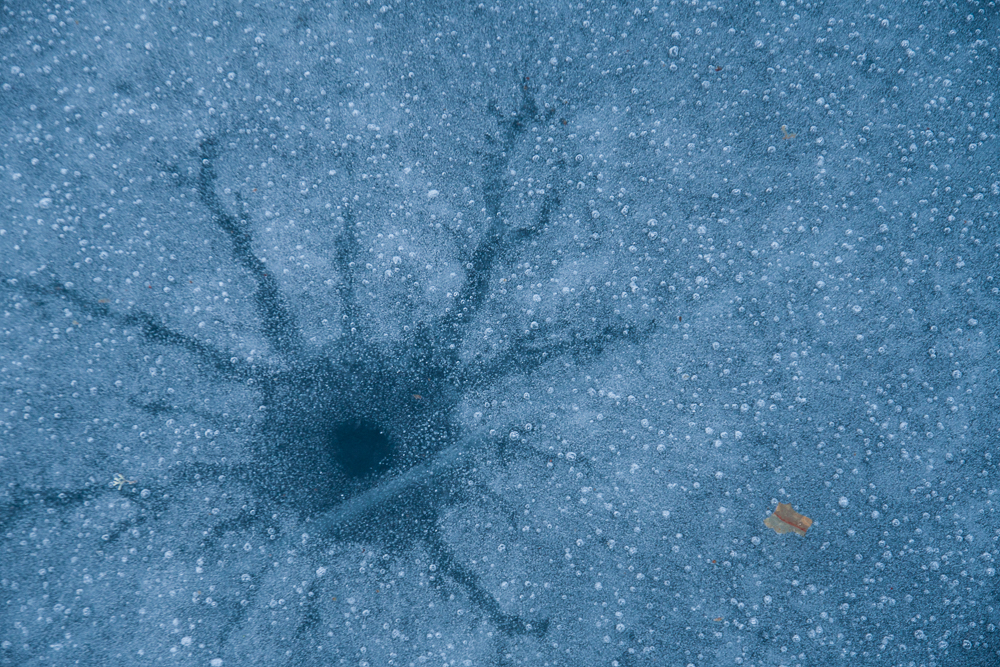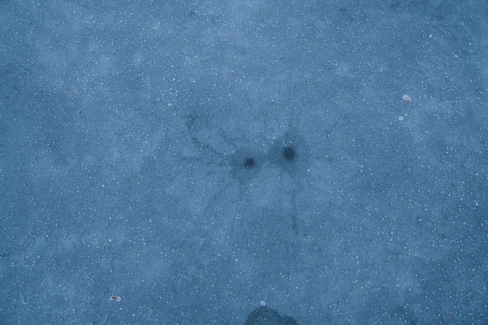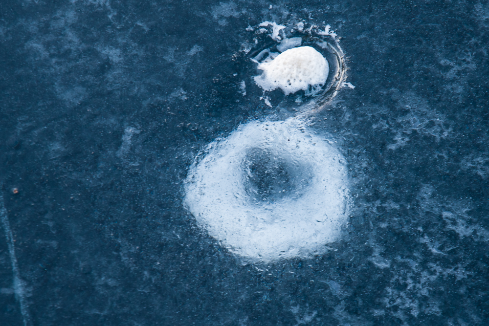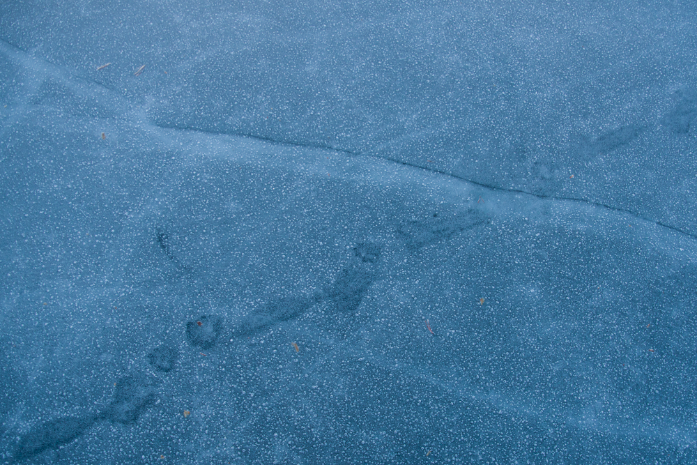 As the grey disappears for a moment and the snow has melted from the ice surface, events and activities occur. The otter is not the only one leaving hurried tracks on the ice. Others seem to peek out to have a look.