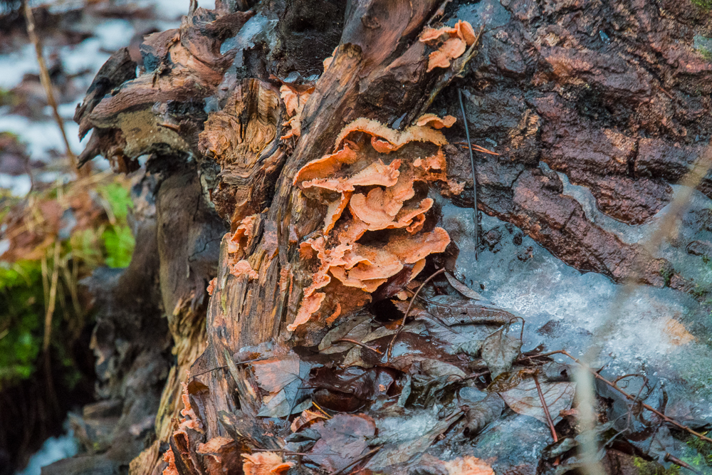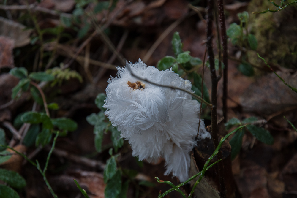 Is it the drops of the mist that makes chlorophyll so green in the middle of winter? The moss too shimmers in green. But not the ice flower!