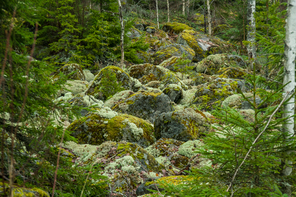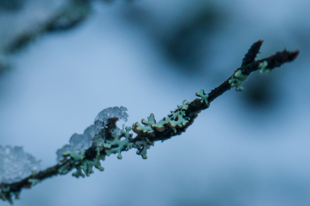 Kan det vara dimmans droppar som får klorofyllen att bli så grön mitt i högvintern? Vitmossan har också den ett skimmer i grönt. Det är bara isblomman som inte dras med!