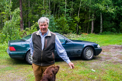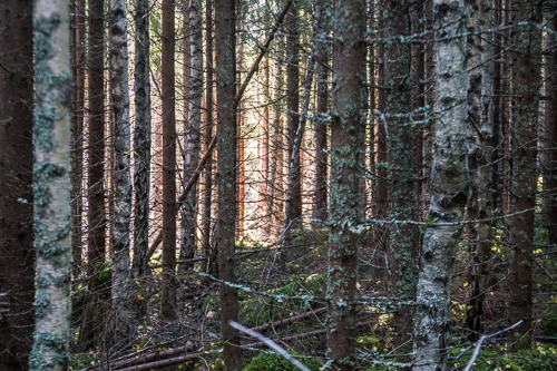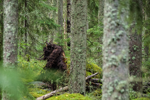 Regnet döljer nästan utsikten. Det är mycket väta som ska ner för att tillfredsställa kärren i skogen. Ibland kommer ljuset fram mellan träden. En sån dag får eremiten välkommet besök.